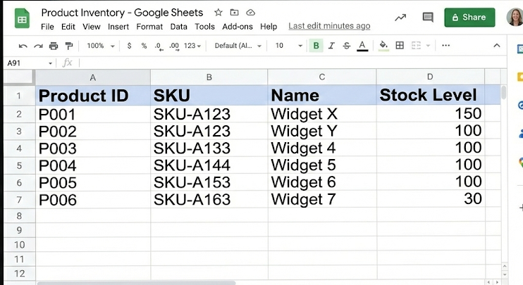Create a Google Sheet with headers: Product ID, SKU, Name, and Stock Level.